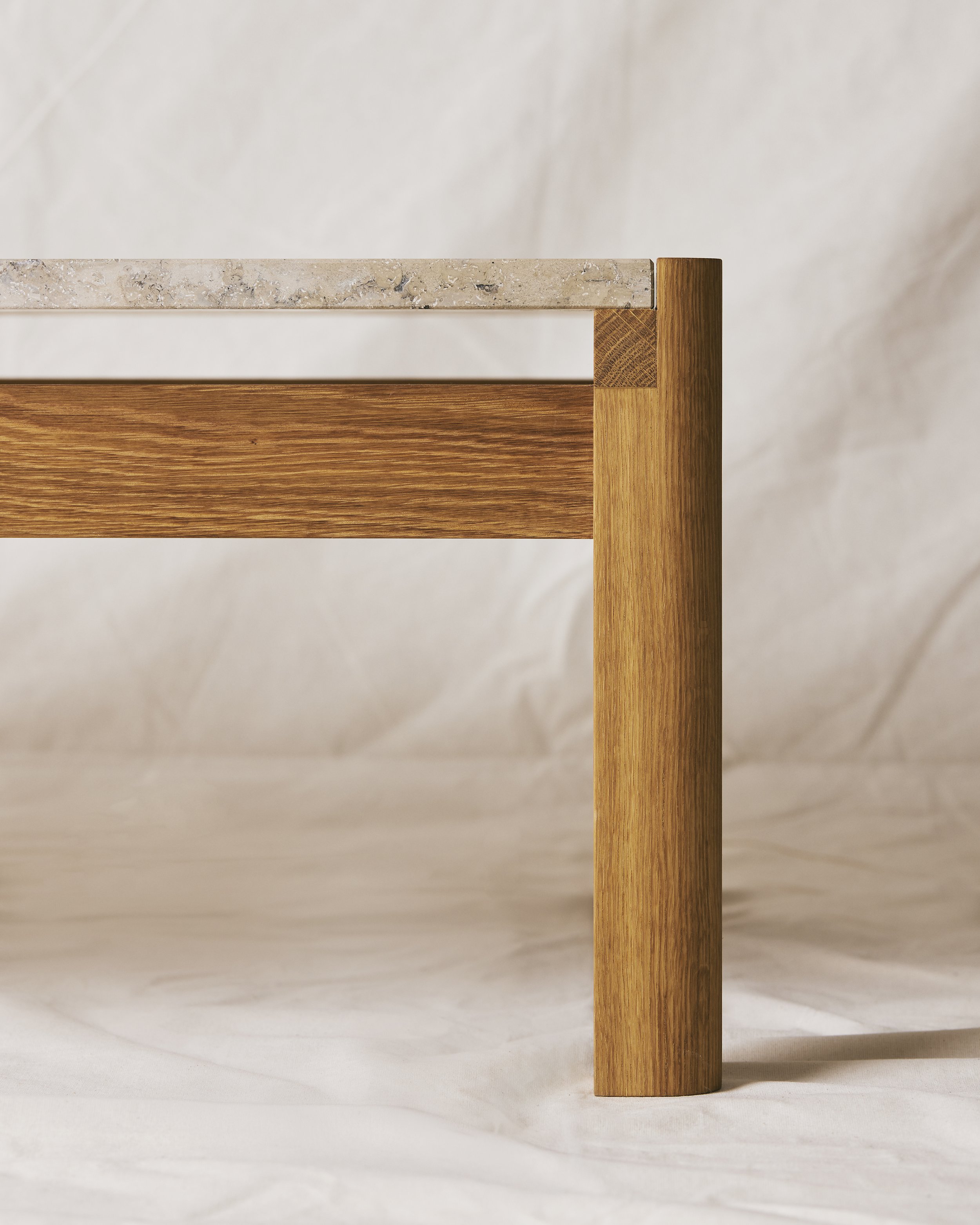 The table combines a Jura Grau Blau limestone top with an frame of European oak.