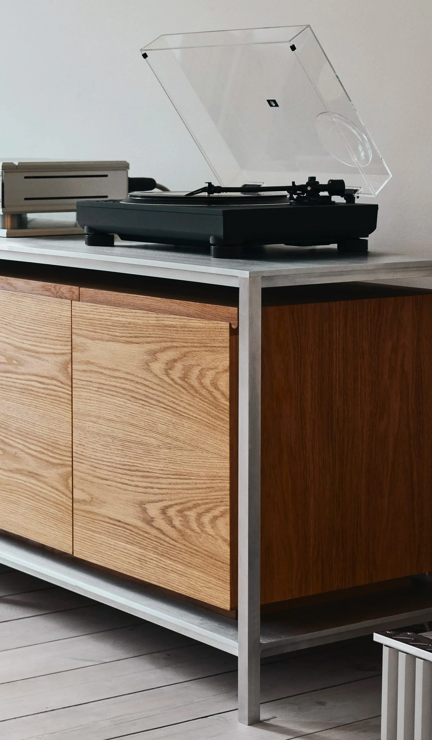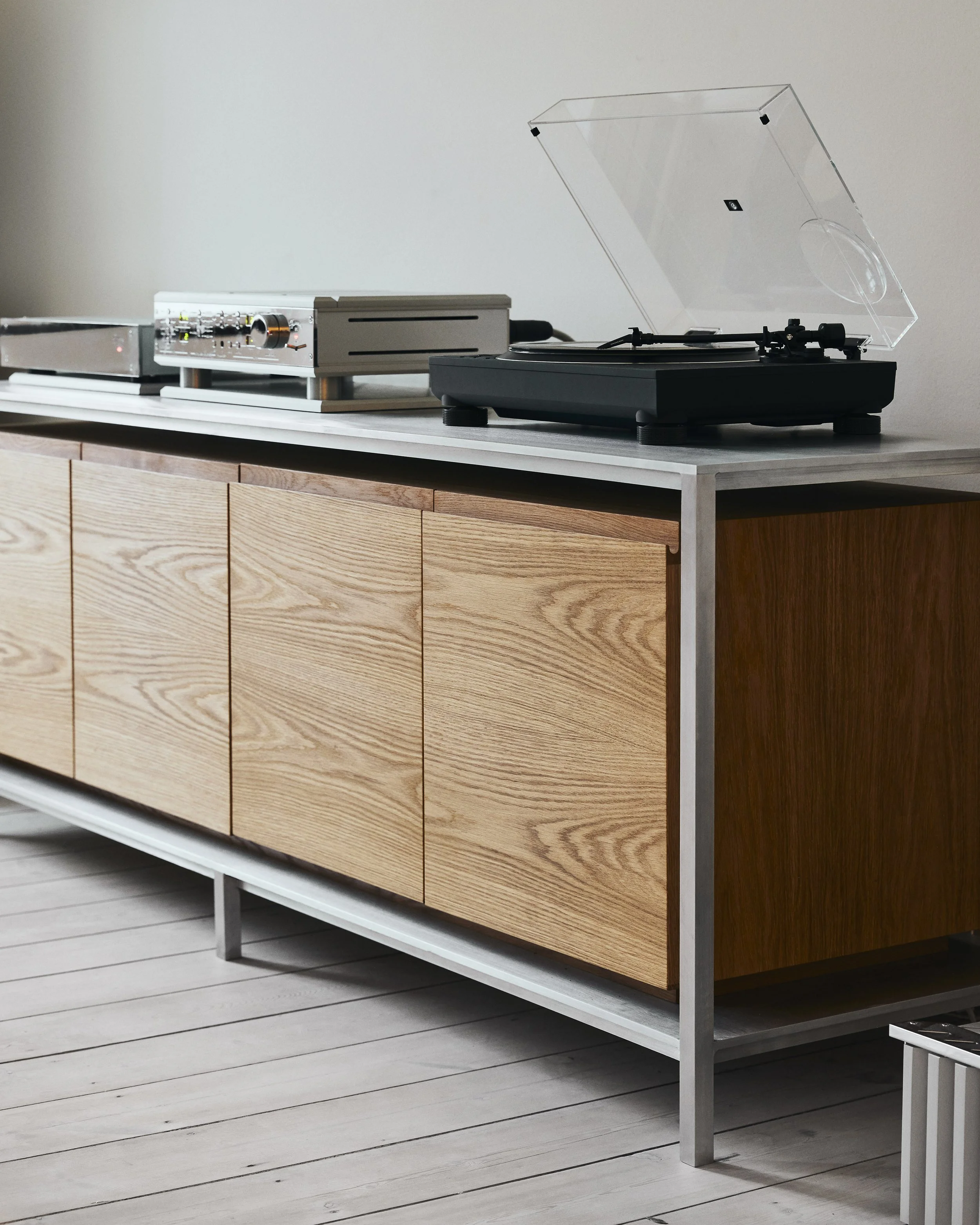 The cabinet is handcrafted from brushed aluminium and European oak, designed to speak the same refined language as an exclusive Burmester sound system.